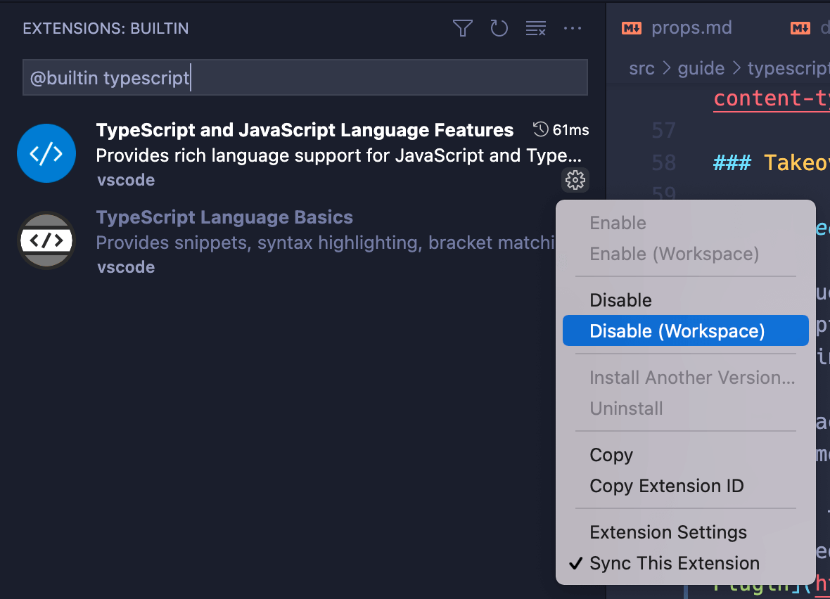 typescriptと入力します(@builtinというプレフィックスは削除しないでください)。 - "TypeScript and JavaScript Language Features" の小さい歯車のアイコンをクリックし、"Disable (Workspace)" を選択してください。
